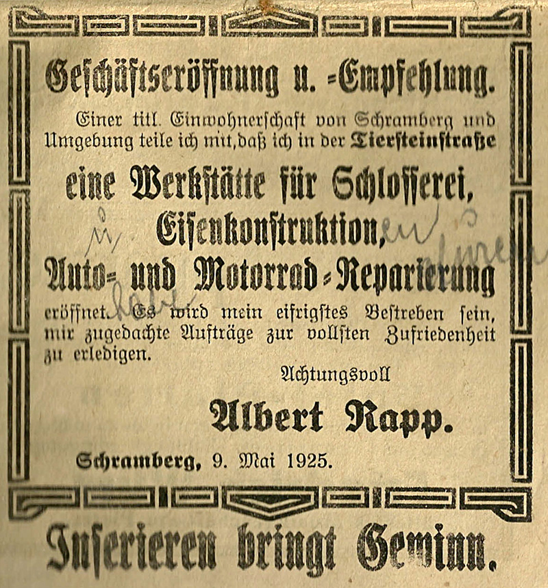 Den ersten Schritt in die Selbständigkeit machte Albert Rapp am 09.Mai 1925. Er gründete in Schramberg in der Tiersteinstraße eine „Werkstätte für Schlosserei, Eisenkonstruktionen, Auto und Motoradreparationen“.